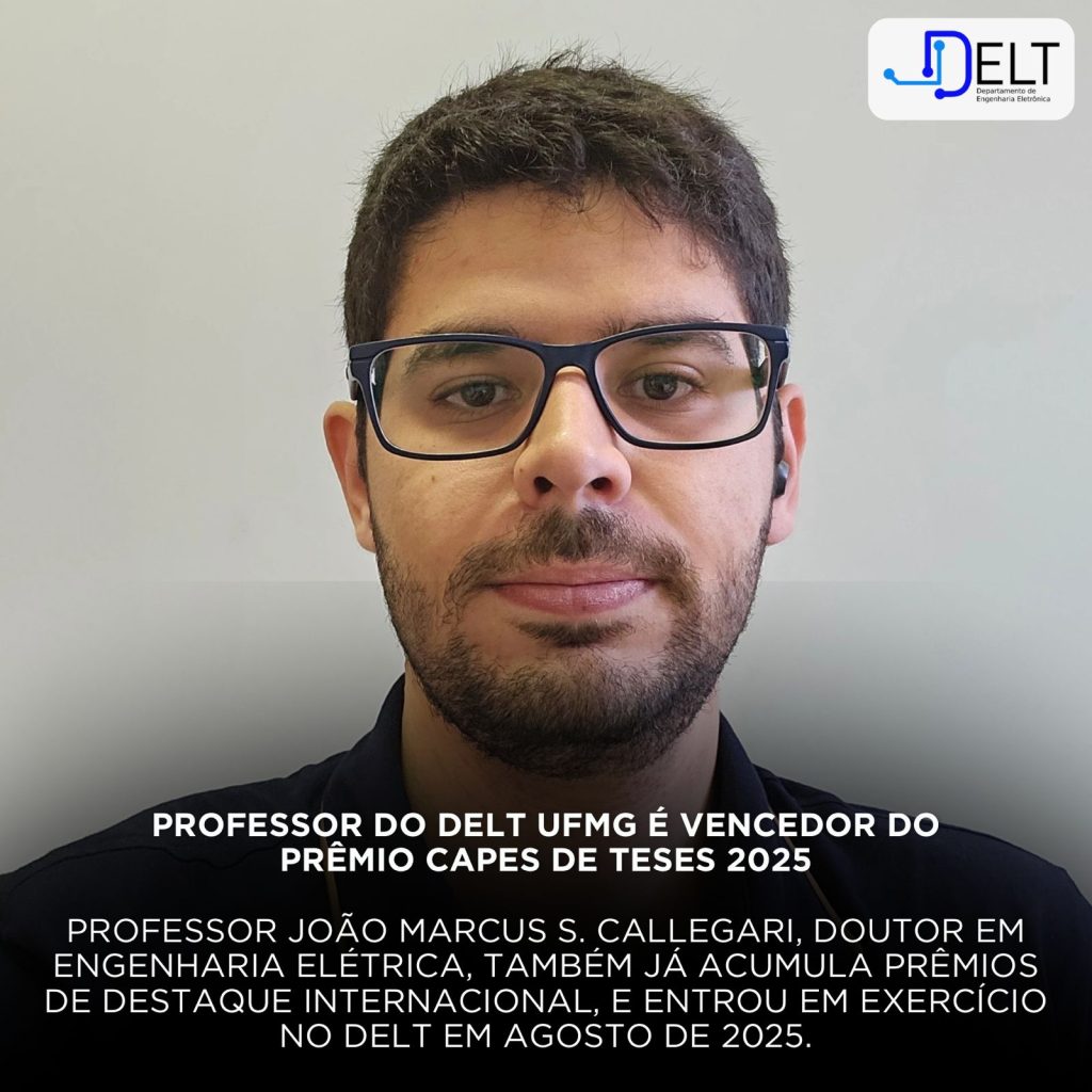 O professor João Marcus S. Callegari, que tomou posse em agosto de 2025 como docente assistente do Departamento de Engenharia Eletrônica da UFMG (DELT/UFMG), foi agraciado com o Prêmio CAPES de Teses 2025 na área de Engenharias IV.
